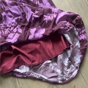 Purple floral crepe (58% Viscose, 42% Rayon). Hourglass. Long sleeves. Square neck. Pull on. Imported.