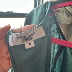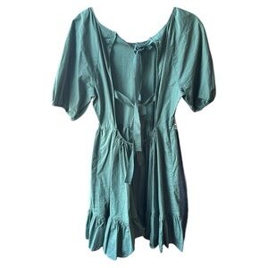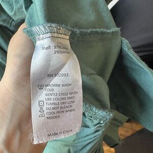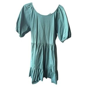 Green cotton blend (97% Cotton, 3% Spandex). Hourglass. Crew neck. Short sleeves. 35" from shoulder to hemline.