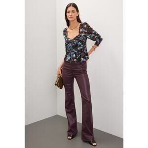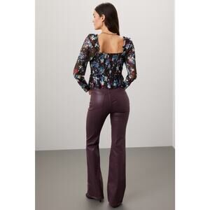 Peter Som Ruched Smocked Tie Sweetheart Long Sleeve Black Floral Peplum Top Size 2