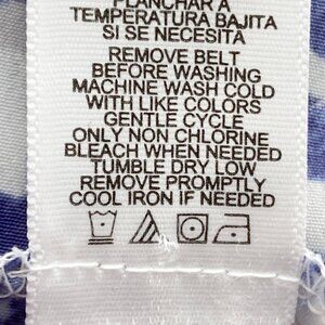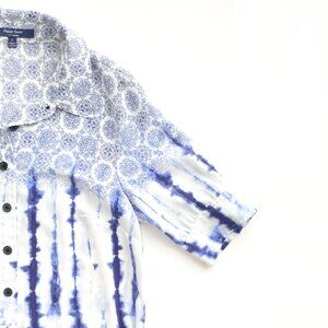 Lightweight shirt dress from Peter Som for Design Nation has full button front, belt/tie with belt loops, short sleeves with button accent, and bottom ruffle hem. Unlined. A mix of tie-dye, floral and shibori type prints, in white and blue.