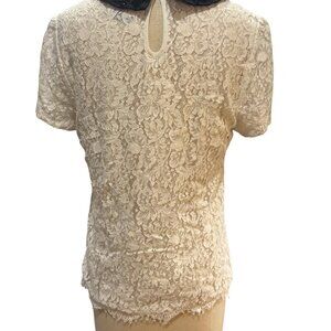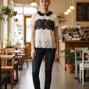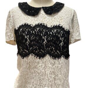 Peter Som x Made in Kind Lace Top, Size 14 – Ivory & Black, Sequined Peter Pan Collar, Short Sleeve