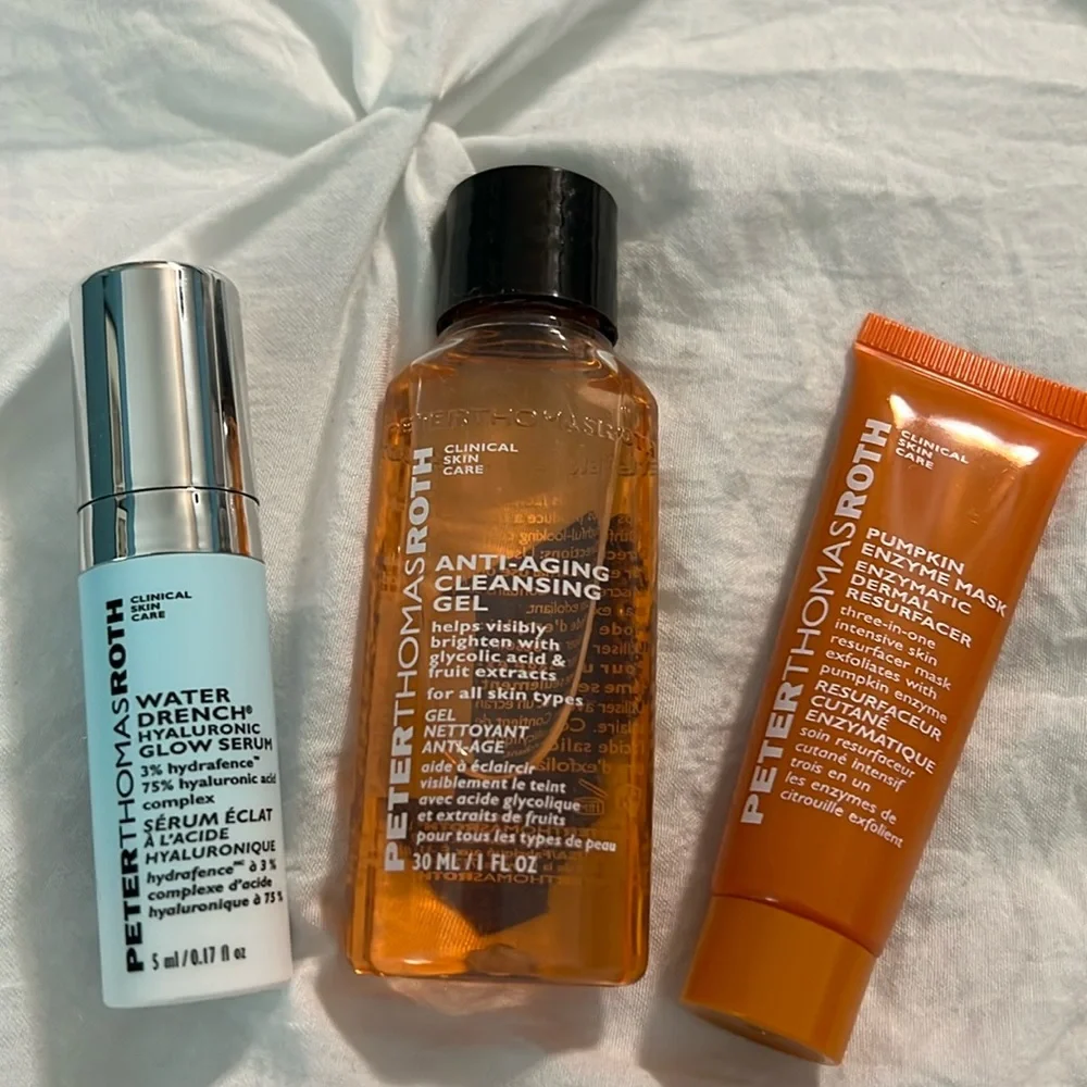 Three piece travel size Peter Thomas Roth set includes water trench, anti-aging, cleansing gel and pumpkin enzyme mask