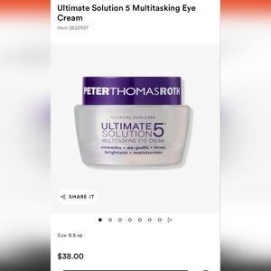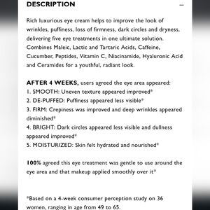 Ultimate Solution 5 Multitasking Eye Creams, 3pc, size 15ml/0.5 fl oz each. Retail price $38+tax each, total retail price was $114+tax. Rich luxurious eye cream helps to improve the look of wrinkles, puffiness, loss of firmness, dark circles and dryness, delivering five eye treatments in one ultimate solution. Combines Maleic, Lactic and Tartaric Acids, Caffeine, Cucumber, Peptides, Vitamin C, Niacinamide, Hyaluronic Acid and Ceramides for a youthful, radiant look.