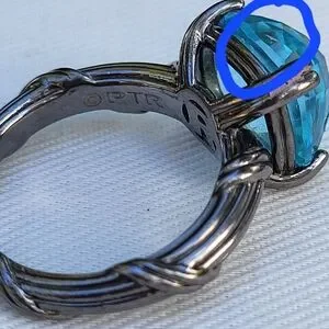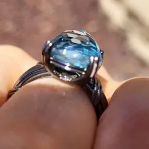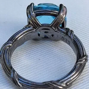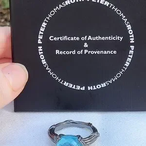 Gently used Peter Thomas Roth sterling silver Ruthenium ring. Size 8. Part of the Reed Ribbons Fantasies collection. 8.40 carat blue topaz cushion cut center stone. Excellent condition with a tiny surface scratch to ring. Please see photos and video.