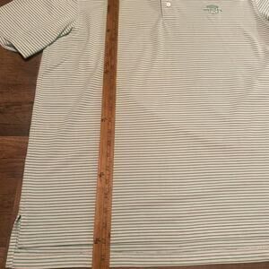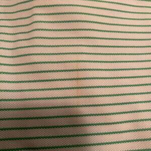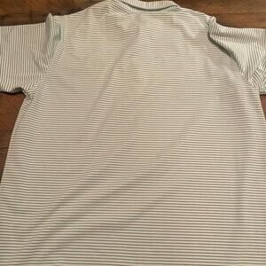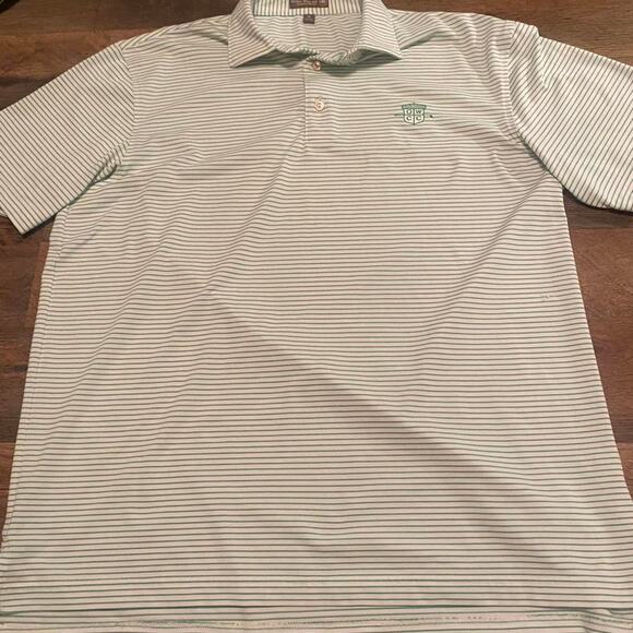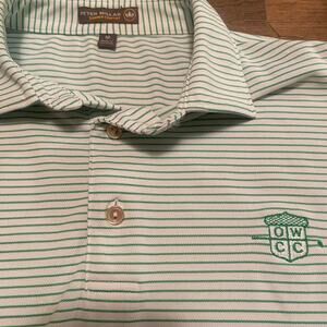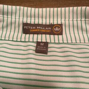 Peter Millar casual dress gold shirt. Preppy styled striped button up. Good condition besides a small stain on the back between the shoulder blades. Not very noticeable unless looking for it.