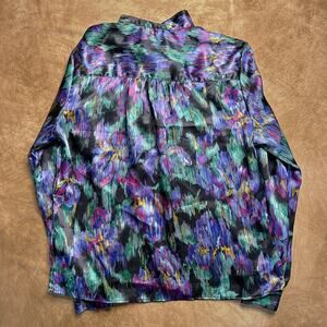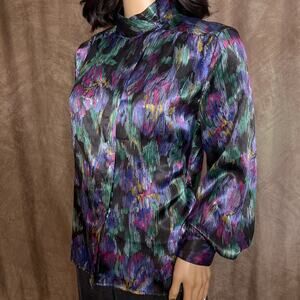 Colorful lightweight satin blouse with a high neckline and puffed sleeves. Green, purple, pink, and gold colors. Hidden button closure. Vintage 1980s.