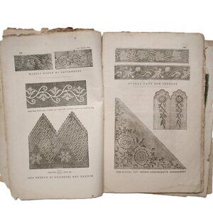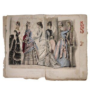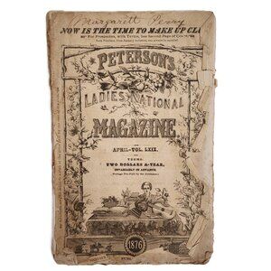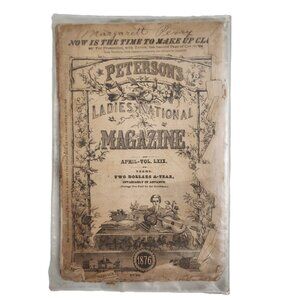 A scarce RARE volume 1876 Peterson’s Ladies National Magazine, featuring stories, fashion, poetry, music, art, and more. A great look at life for wealthier American women in the late Victorian Era. Literature, fashion engravings, crafts, patterns, music. Ownership signature at top. Nicely illustrated with a variety of black-and-white sketches throughout. Advertisements at front and back of each volume. This is an amazing resource. General age-related toning and age to pages The outer covers show nicks, tears, creases, and some age related deterioration. 6.5"x10"