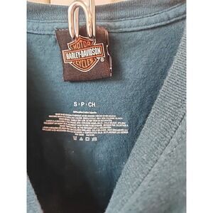 The product is a small-sized T-shirt featuring the Harley-Davidson brand logo, likely associated with the famous American motorcycle manufacturer. This collectible item would appeal to fans of Harley-Davidson and motorcycle enthusiasts, showcasing a piece of American culture and lifestyle. The shirt would be a stylish and comfortable way for fans to display their love for the brand and their passion for motorcycles.