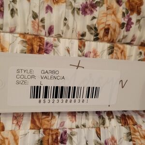 NWT Petersyn Garbo Floral Print Dress Size L, cream color with green, orange/rust, purple floral print, plain weave fabric, ruched bodice, adjustable shoulder straps, square neckline, hidden zip at back, absolutely beautiful dress!