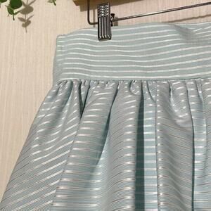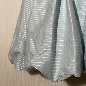 This Petersyn “Lennon” mini skirt in aqua and white stripes offers playful structure with a bubble hem and wide waistband. The side-seam zipper ensures a clean silhouette, and the subtle sheen fabric elevates the design. Style it for evening events, summer parties, or date nights—pair with a fitted top and heels or sandals. NWT condition with tags intact makes it an ideal gift or special occasion piece.