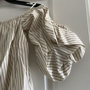 Womens Petersyn blouse. Elastic across the top for an off the shoulder look. Balloon sleeves. Pin striped. Size XS.