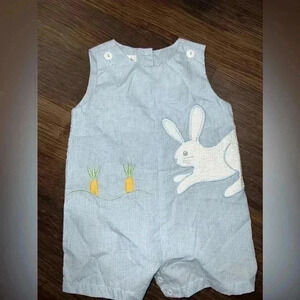 Adorable bodysuit with bunny and carrot design. Soft fabric. Easy snap closure.