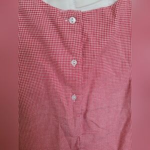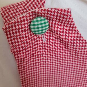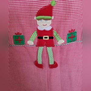 beautiful condition. brand new with tag. from special boutique Petit Ami. elf on a gingham red and white background. white turtleneck underneath, snap bottoms on legs.