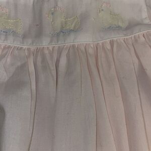 Pale pink cotton poly blended fabric, sleeveless dress by Petit Ami in a size 3 months. Precious ducks are embroidered in a row on the front. Approximate measurements shown in photos. In excellent pre-owned condition.