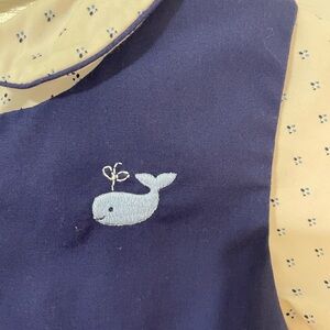 Charming romper with delicate blue patterns. Features a classic white collar.