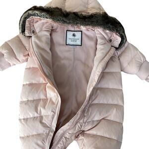 Petit Bateau France warm bunting snowsuit in a blush pink color size 6 months. Down filled with fleece lined interior. Removable faux fur around hood, down mittens and booties snap on and off, zippered closure. Excellent like new condition.