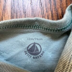 Adorable Petit Bateau bodysuit set with star designs. Includes green and white pieces. Perfect for comfort and style. See stains on white bodysuit. Tag says 12 mo but they run small