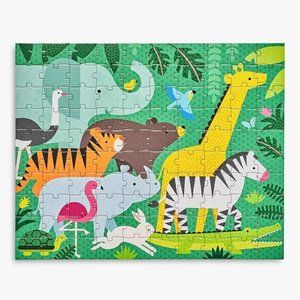 Piece together this Animal Menagerie On The Go Puzzle from Petit Collage and see how many jungle animals you can spot! This charming 49-piece puzzle is two-sided, featuring two unique designs with more friendly animals for double the fun! The portable design makes it ideal to take along on trips short and long.