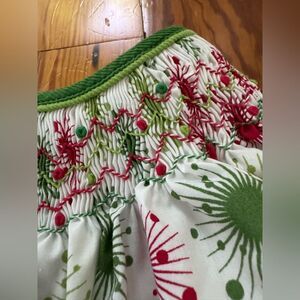 Lightly worn. Red and green pattern. Smocking at collar. Size 18 mos