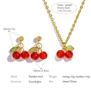 Vibrant cherry drop earrings with gold accents. Features red cherries and green leaves.