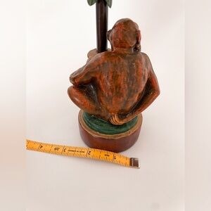 (1) shelf mantle candle holder depicting a seated monkey with a wide eyed expression holding a barrel with a palm tree in it, the top area for one single candle.