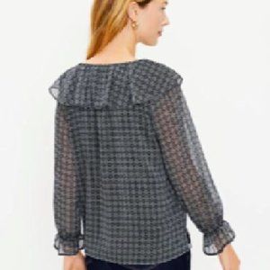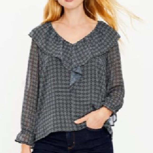 A ruffled V-neck crowns this flowy blouse in the kind of pretty drama that's perfect for every day. V-neck. Long sleeves with elasticized bell cuffs. Sheer, lined in black. I have not worn this. Purchased for an event that was canceled.