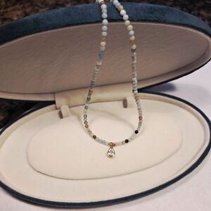 This petite 3mm jadeite beaded necklace and zirconia teardrop pendant in a 14K gold-filled setting and toggle clasp, presents a casual vibe with its softness and colors. Classified as a semi-precious stone, in ancient times, it was believed to be a talisman to ward off evil. It measures 16 inches and will work well as a stacker piece. It was handcrafted in my studio in Bend, Oregon. Shipped in a satin pouch. There is always something special from Fucci Minnulli.
