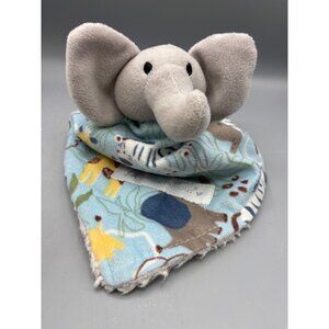 Cozy and soft lovey featuring an adorable elephant plush head and jungle animal print. Ideal for soothing and comforting babies.
