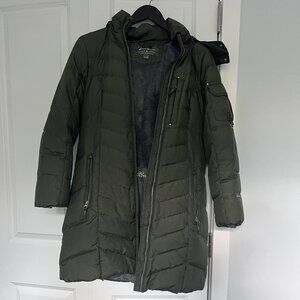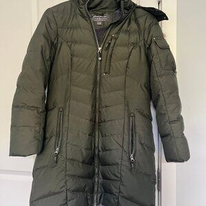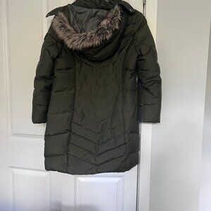 I've owned three Eddie Bauer winter parkas. I love the colors, the feminine shaping, the warmth, the pockets. This one is a petite medium in a beautiful olive green with a slight sheen to it. Has a detachable hood with a faux fir decoration that also detaches for washing. The parka has a StormRepel DWR water-repellent finish and 650 fill premium down. Two zippered hand pockets, one zippered chest pocket, one snap arm pocket. As you can see on the model, the quilting of the jacket gives it a flattering shape, and makes me feel less schlumpy wearing to the office LOL. Composition: 53% nylon/32% polyester/15% cotton shell. Care: Machine wash cold delicate, after removing fur trim, tumble dry low with tennis ball.