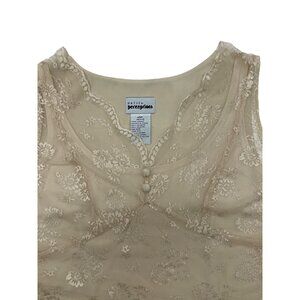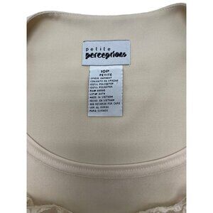 This Petite Perceptions 2-in-1 top, size 10P, is a chic addition to any wardrobe. The beige, sleeveless polyester top features an inset attached at shoulders, armholes, and side seams, complete with side zipper.