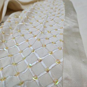 Vintage 80's polyester blazer top with pearl amd brass buttons up the front, silk striping on front and sleeves, embroidered cross hatch pattern and sequins. PLUS shoulder pads. This bad boy is ready to take you to your holiday party! Channel your inner Golden Girl today!