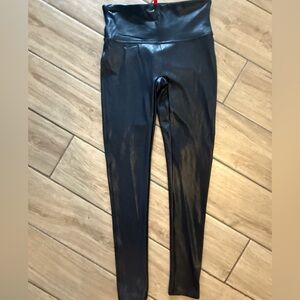 Stylish black liquid faux leather shiny leggings with wide waistband. Petite sizing. Ideal for a modern look. Size medium, inseam 25.5”