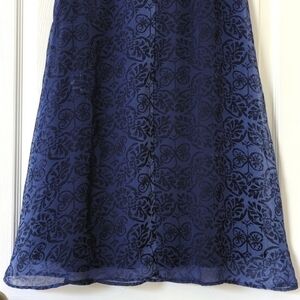 VTG and straight out of the 80s - This beautiful skirt was made in the USA to feature an a-line silhouette that's meant to be worn high waisted and fall below the knee, giving it a midi length. It has a talon zipper and button closure on the left hip. It is composed of a dark blue floral motif printed chiffon that is fully lined. It is extremely flowy, thin, lightweight, breathable and comfortable. Pairs great with solid tanks, camis, or crop tops and chunky sandals in the Spring and Summer! A totally retro piece that's very versatile with a bohemian boho chic vibe! High quality!