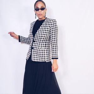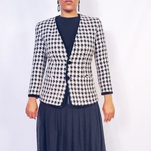 Petite Sophisticate black and white houndstooth blazer with velvet trimming, front pockets two button closure. Lined.