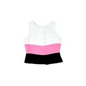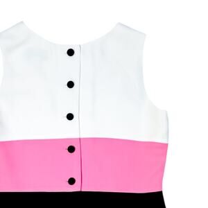 This stylish Petite Sophisticate blouse features a modern color block design in white, pink, and black. Designed with a flattering petite fit, this sleeveless top has a chic button-back closure and is fully lined for a smooth and comfortable feel.