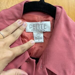 Elegant rose blazer with button closure. Features two front pockets. Ideal for professional settings.