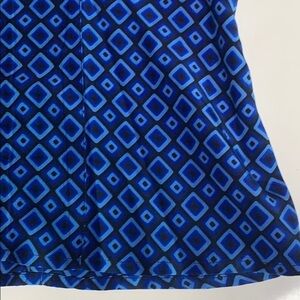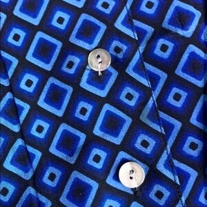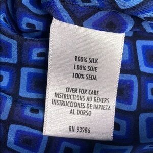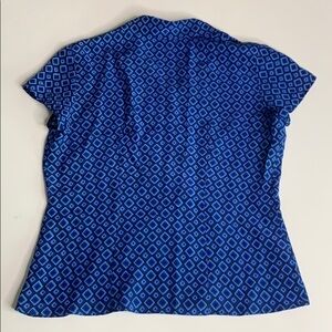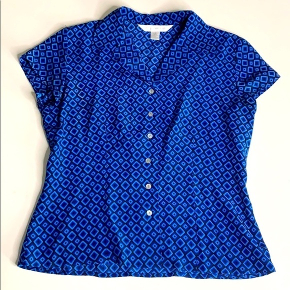 Petite Sophisticate Silk V Neck button down blouse blue aop print