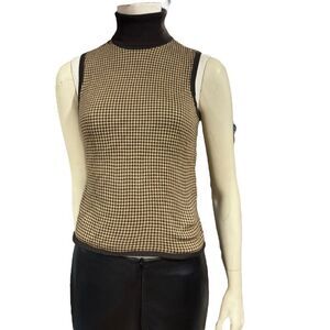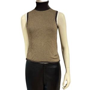 Vintage Sleeveless Houndstooth Turtleneck Top – Beige and Black, Knit Fabric. Features a classic houndstooth pattern with a high dark brown turtleneck collar and dark brown trim around the armholes. Perfect for layering or wearing on its own for a retro-chic look. Great condition with no visible flaws.