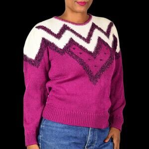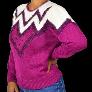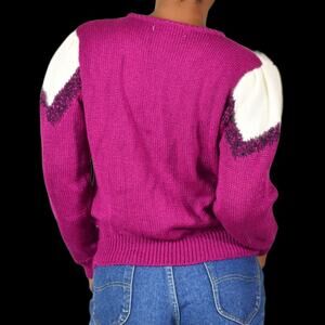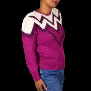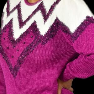 Vintage Petite Sophisticate Sweater FEATURES a chevron neckline print and fuzzy front upper half. Vivid magenta color. Bead accents. Round neck. Long sleeves.
