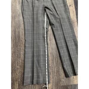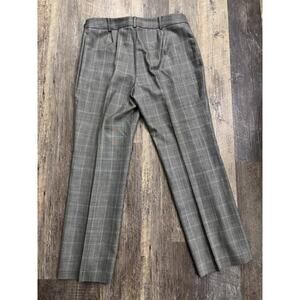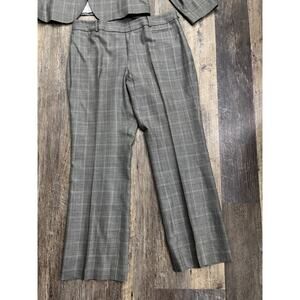 A stylish women's gray plaid suit from Petite Sophisticate, featuring a tailored blazer and matching pants. Perfect for formal occasions or professional settings. It is a size 14 and in excellent used condition.