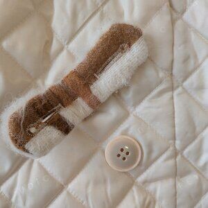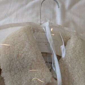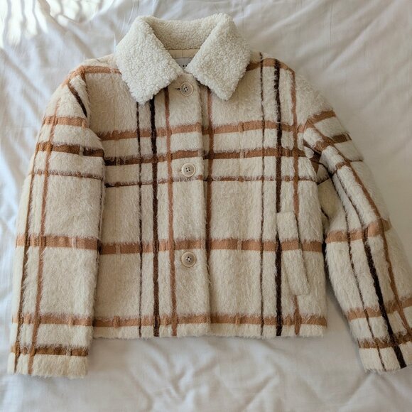 Cropped wool jacket with a sherpa collar that can be folded down or styled standing up. Includes the short accessory to hold up the collar, an extra button, and the original hanger and garment bag. I haven't worn it as much as I wanted to and hope it can find a better home. In excellent condition.