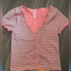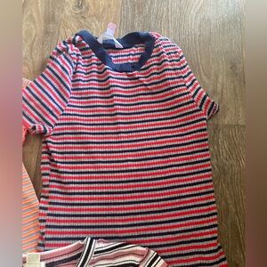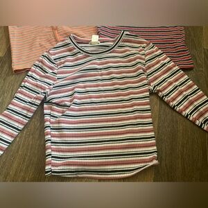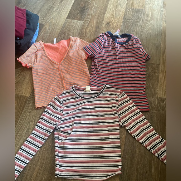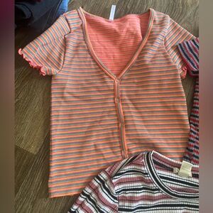 Cute petite shirts can also be for very young girls, also fits adult if ur petite. The orange stripes and the pink with black stripes are crop tops
