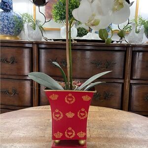 Petite red and gold metal toleware footed cachepot orchid pot Allen G Designs