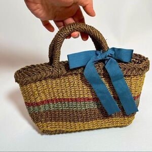 Small rope woven bag with handles. Colors are dark brown, light brown, red and blue. Blue bow on handle. Soft woven natural plant material. Beautiful rope woven bag.