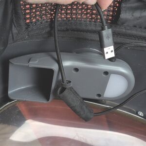 Built in fan, mesh hole, ventilation system for air circulation, charged with built in usb cord. There is a zip pocket for a portable charger, but charger not included.