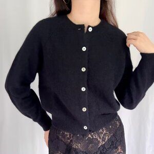 Features a crew neck, fitted raglan sleeves, and ribbing at the neckline, cuffs, and hem. A line of shell buttons extends down the front. Retail Price $328 usd.