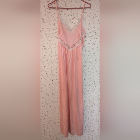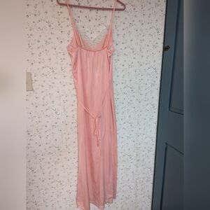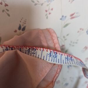 Experience comfort and elegance with peach maxi slip dress intimate wear. The aize is large. The measurements are 20" across the chest, 11" strap length not adjustable, 43" night gown slip dress length. Nylon fabric. No flaws. Made in the USA.
