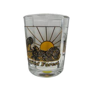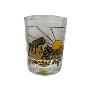 This souvenir glass tumbler / lowball glass features a colorful design commemorating the Petrified Forest with vivid sun and mountain elements. Marked Zai and made in the USA with 22k gold. Measuring 4” tall, it’s perfect for collectors or as a keepsake.