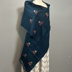 Petroleum Green Cotton Embroidered Tasseled Scarf