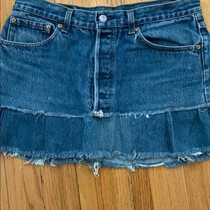 Petros Ruffled Converted Levi’s Mini. Raw hem bottom. Waist sits high and measures 16.5” across lying flat. Length of skirt 14”.